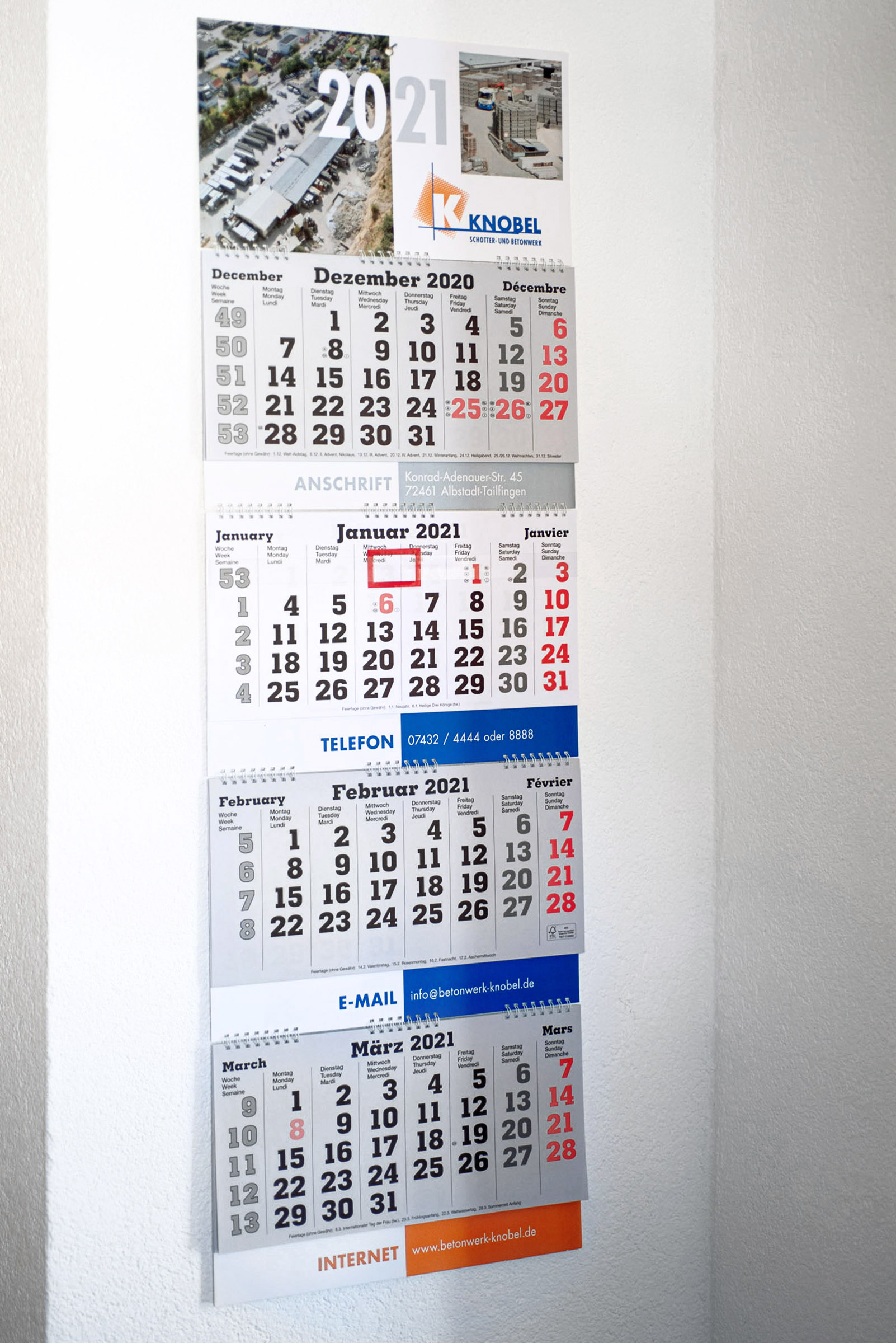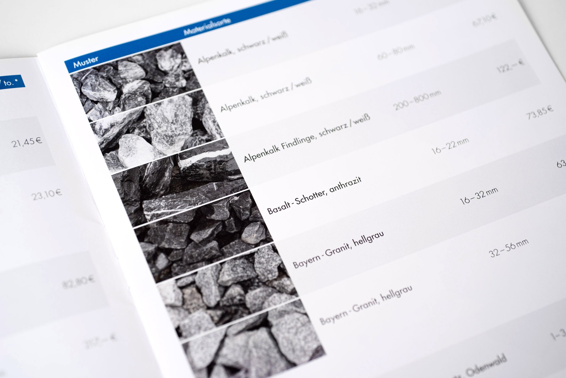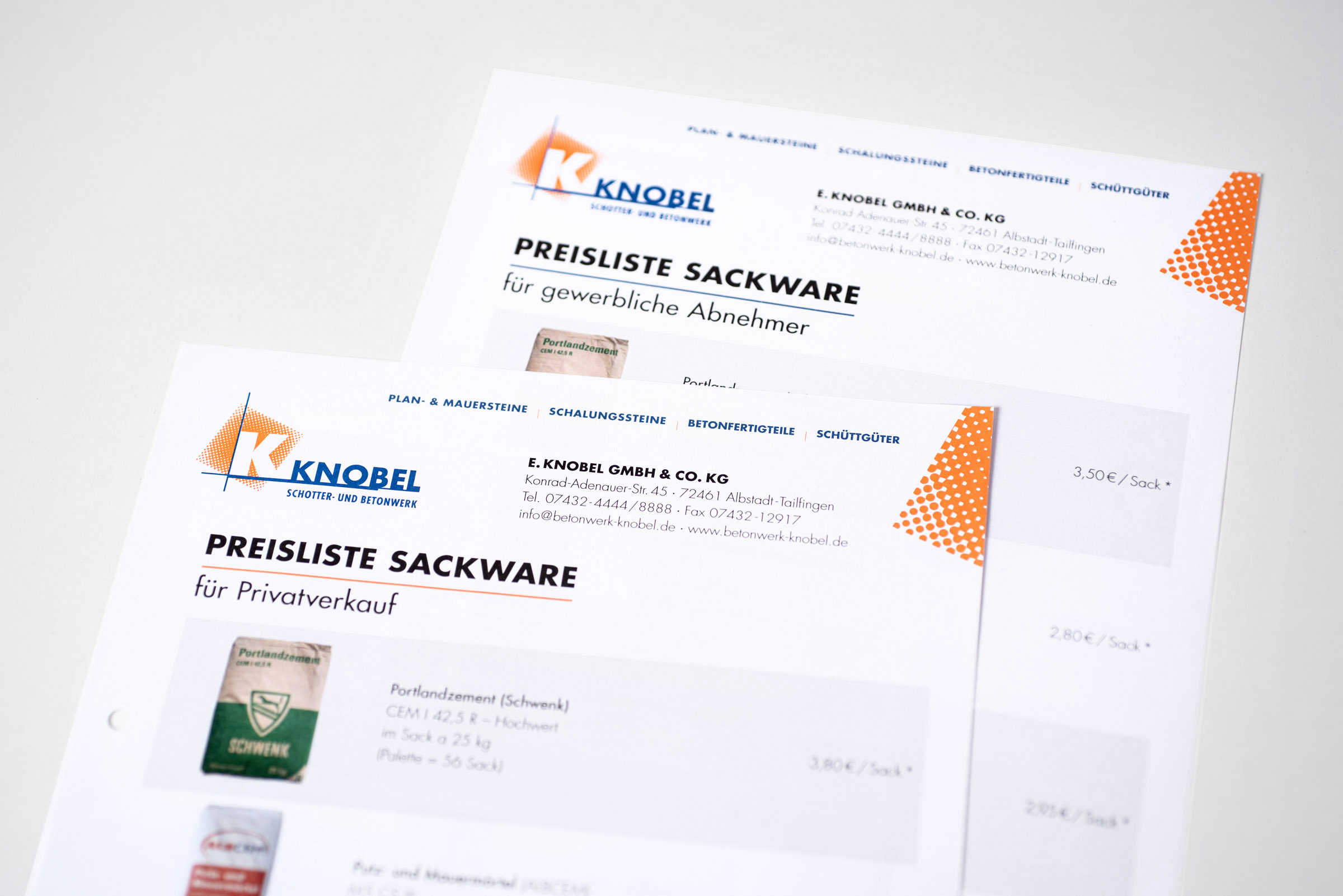Neugestaltung der jährlich erscheinenden Preisliste, Aktionsflyern und Geschäftspapieren für die Betonwerk Knobel GmbH & Co. KG in Albstadt-Truchtelfingen. Der Clou an den Preislisten sind die Produktabbildungen der Schüttgüter, die (mit Ausnahme groben Schotters und großer Wacken) im Maßstab M 1:1 abgebildet sind – so weiß der Kunde genau, was er ordert.