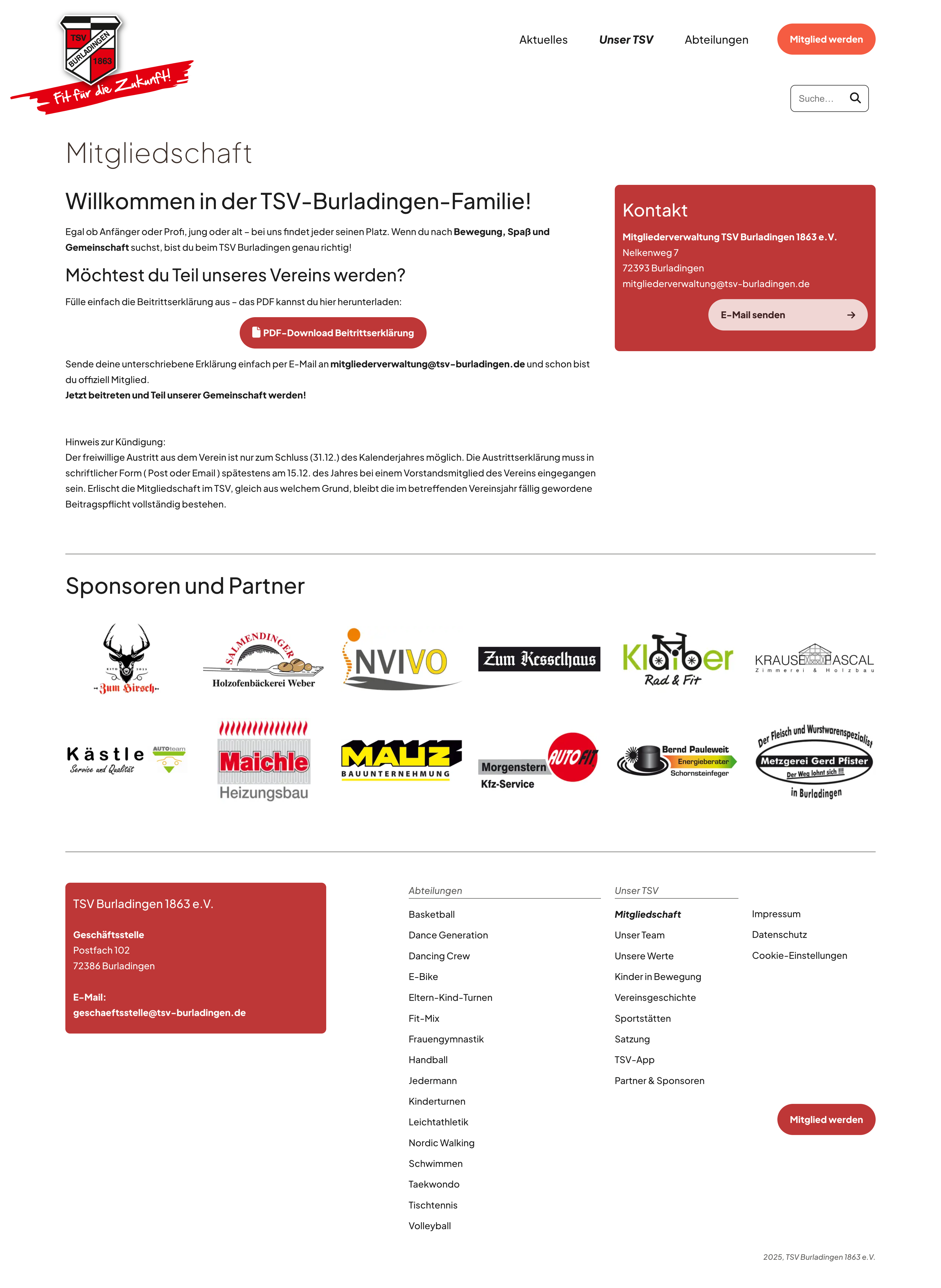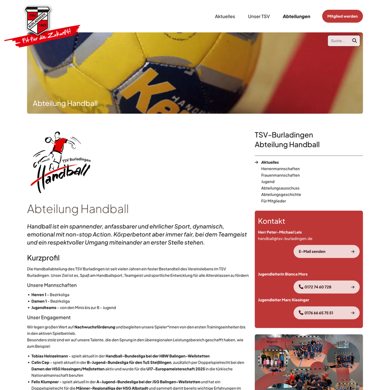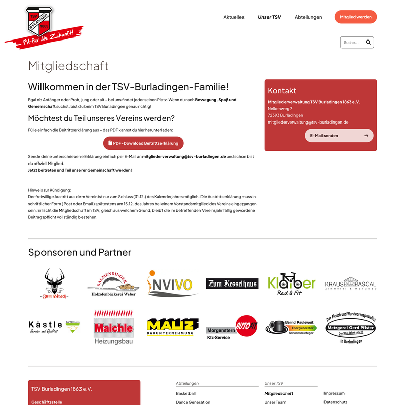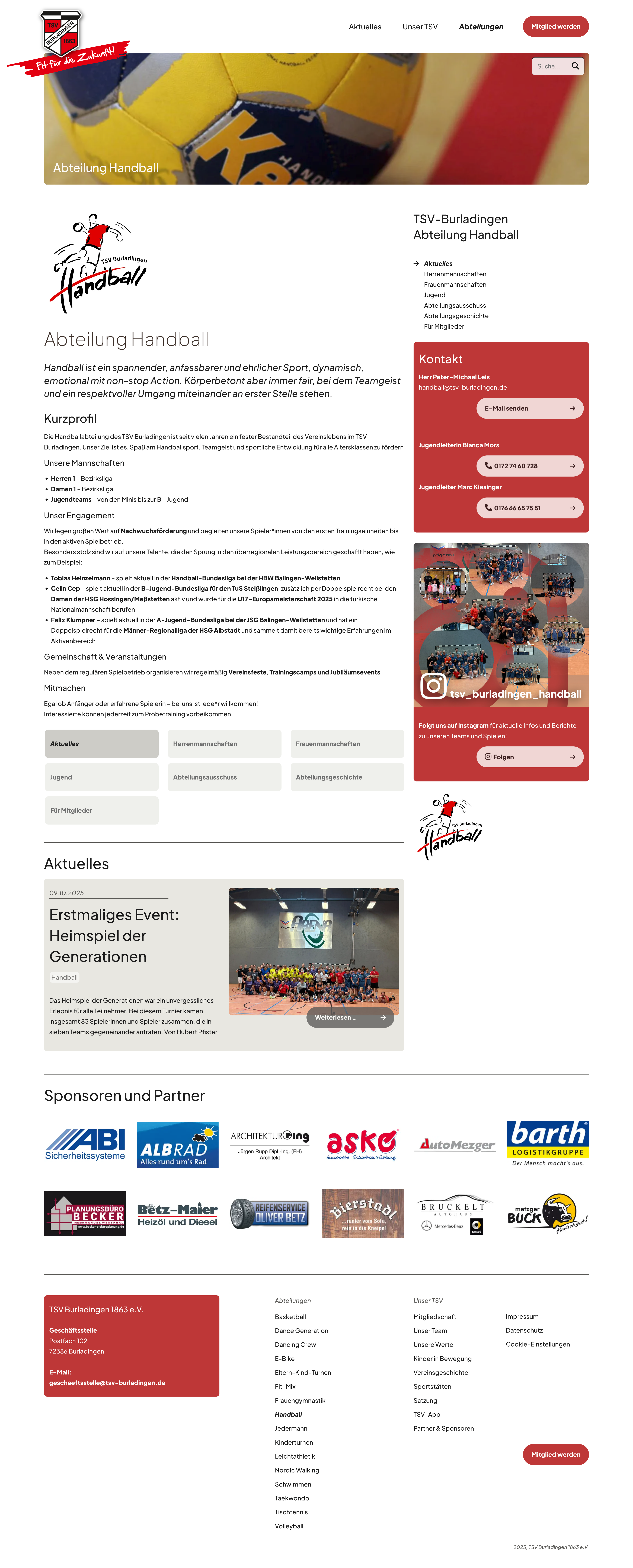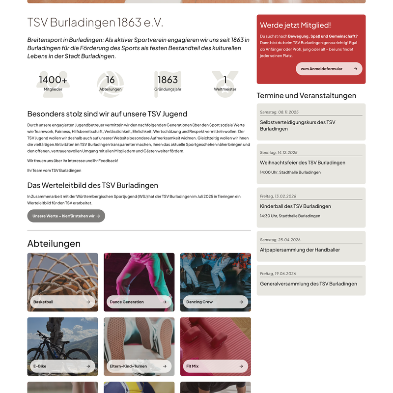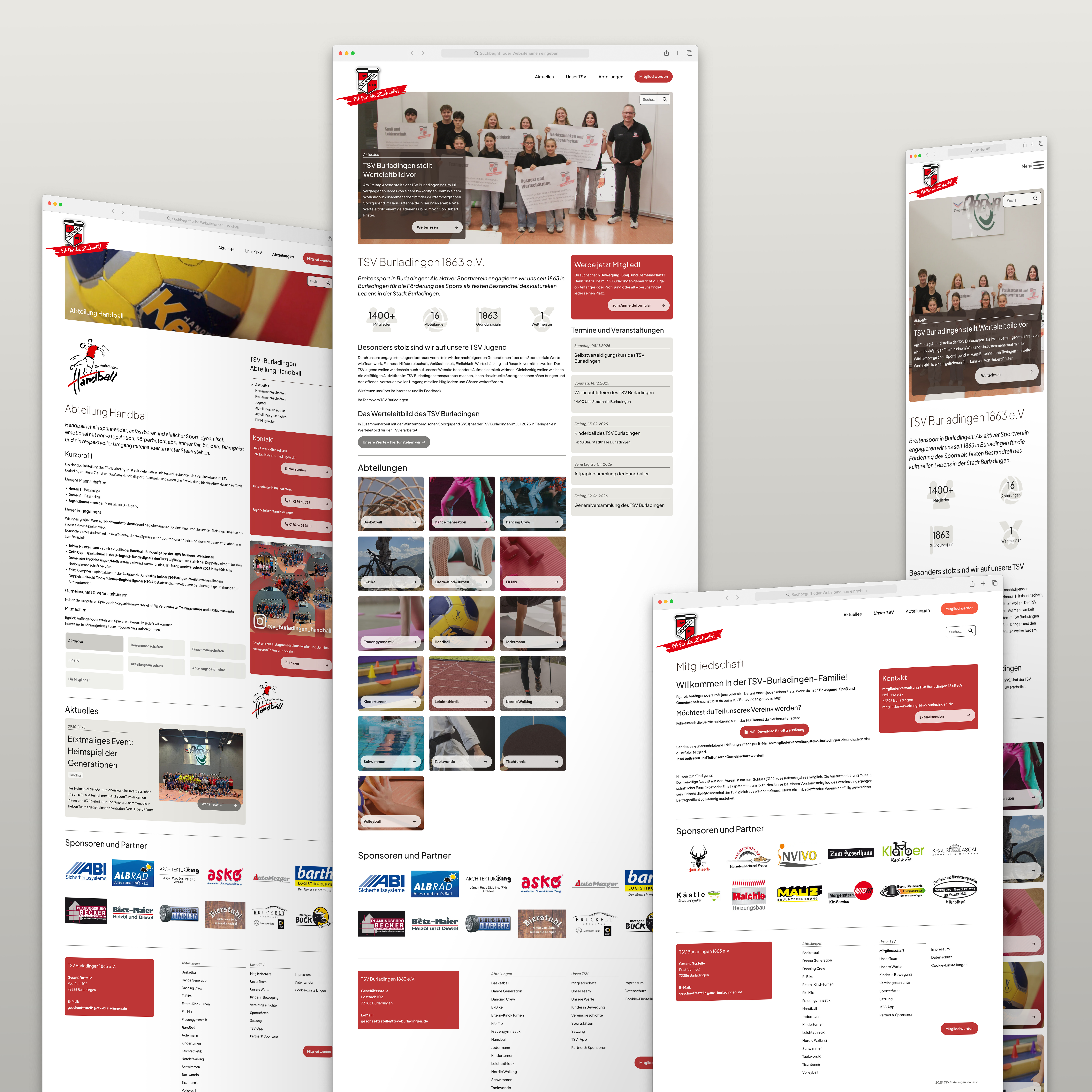 Webdesign und Realisierung einer neuen Website für den TSV Burladingen 1863 e.V. Ein übersichtliches, reduziertes Layout bietet Raum für Vereinsnachrichten, Infos und das umfassende Angebot des TSV und seiner 16 Sportabteilungen. Durch den responsiven Aufbau ist sichergestellt, dass die vielen Inhalte auf allen Bildschirmgrößen lesbar und ansprechend präsentiert werden.